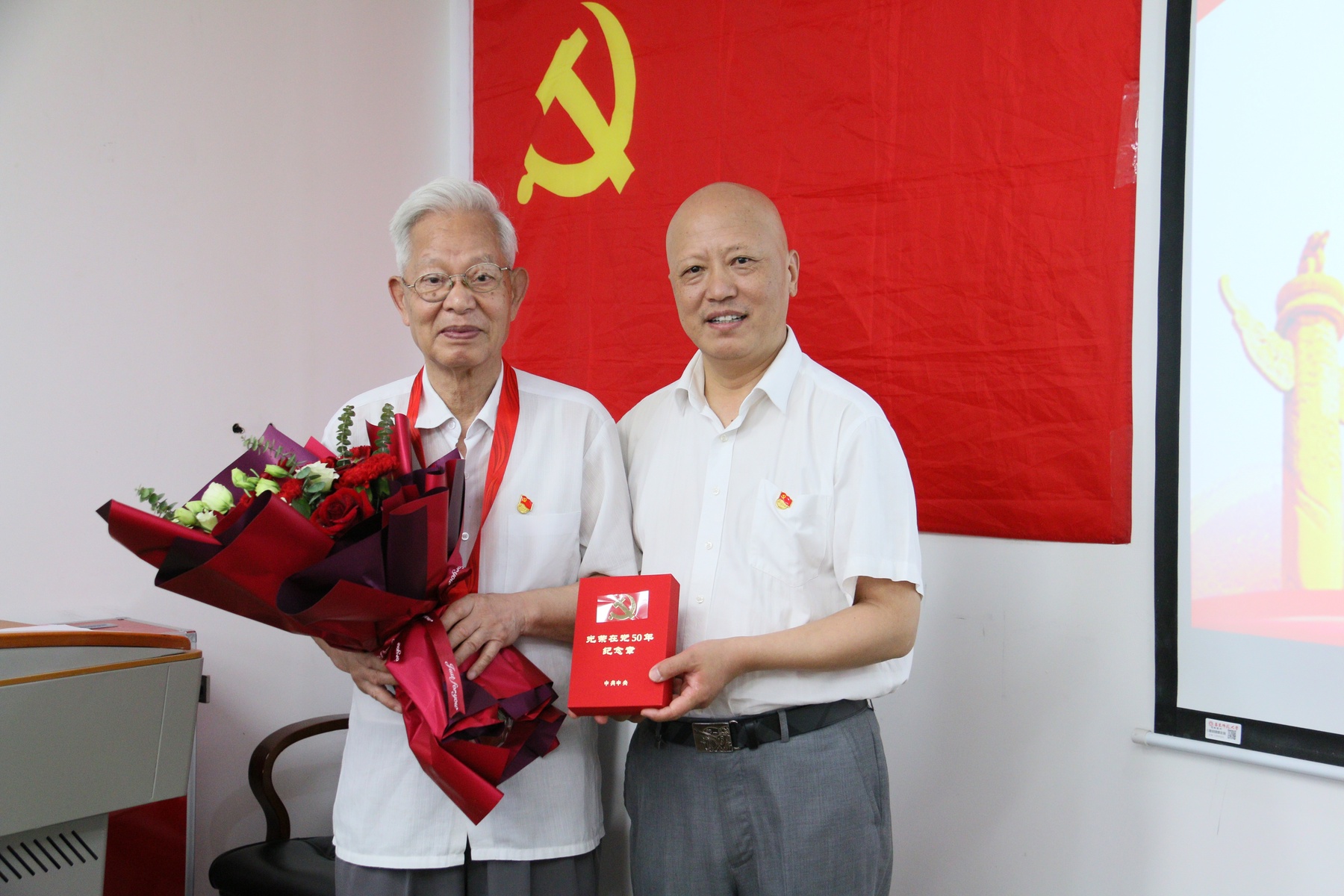 大会在庄严的国歌声中拉开帷幕。系党委书记赵正桥首先为老党员代表邬正洪老师颁发了“光荣在党50年”纪念章。这是今年党中央首次为党龄达到50周年、一贯表现良好的健在党员所颁发的荣誉奖章,以致敬他们不忘初心、牢记使命,勇攀高峰、永葆青春的不朽品质。此次,政治学系共有9名老党员获颁纪念章,其中党龄最长的为67年。奖章颁发后,全场掌声雷动,全体党员同志纷纷表示要虚心向老党员们学习,坚定理想信念,持守初心、永远奋斗!