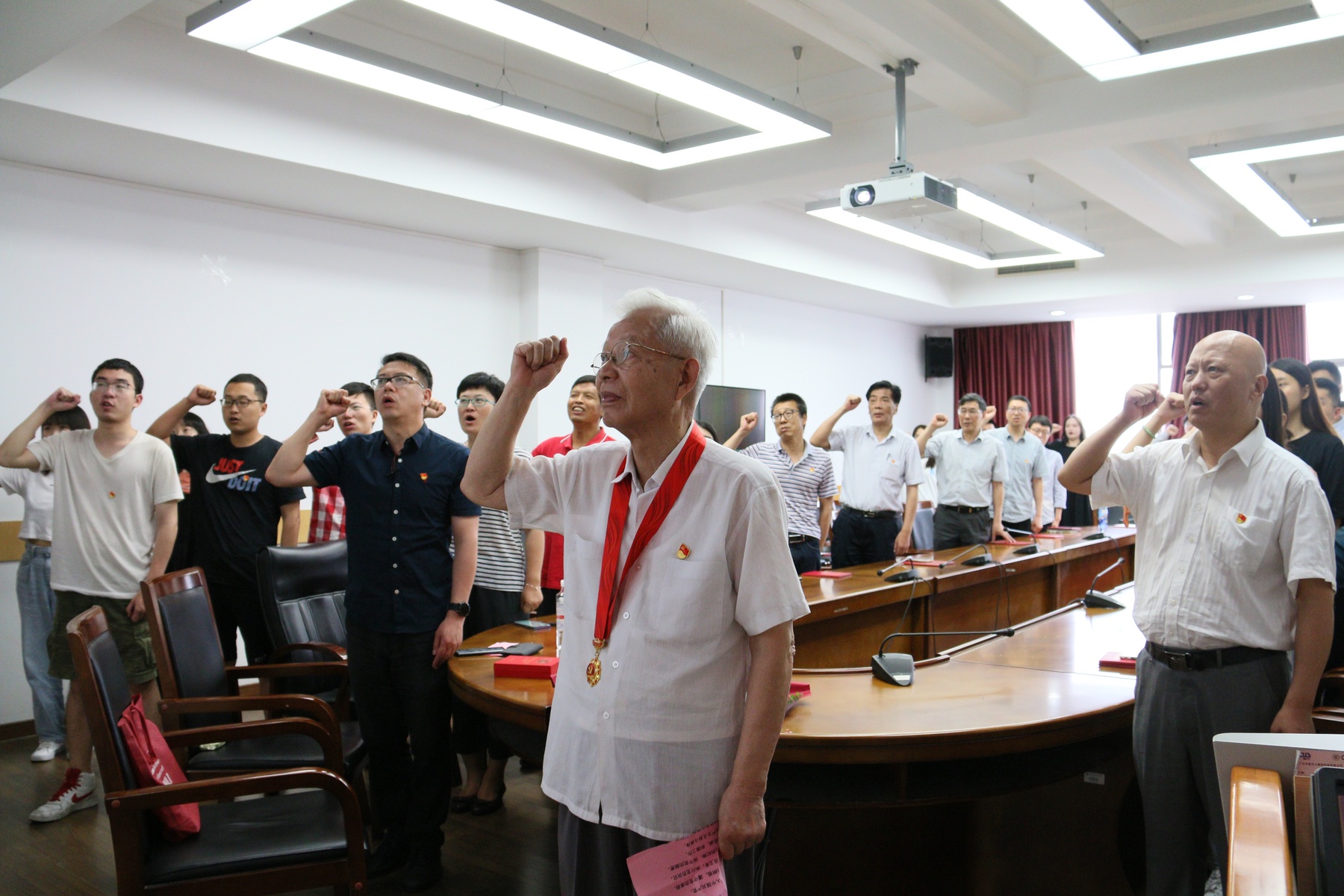 党课过后,大会进入最后一项议程。7名新发展的学生预备党员在“光荣在党50年”纪念章获得者邬正洪老师的带领下,面向党旗,举起右手,庄严宣誓,其余参会党员也共同重温了入党誓词。宣誓完毕后,大会在合唱《国际歌》中落下帷幕。