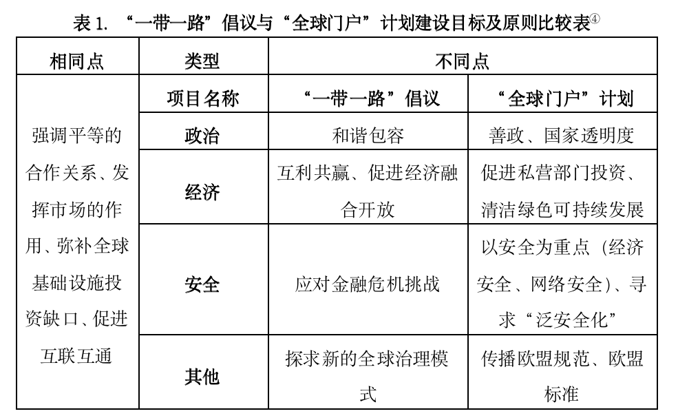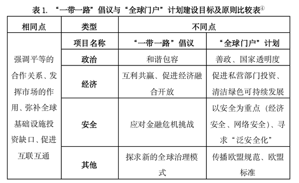 “全球门户”计划作为欧盟未来大规模全球基建投资项目的指导性政策,与同样作为海外基建指导项目的“一带一路”倡议在部分经济建设目标上具有重合,两者都致力于促进自身与世界其他地区的经济发展。大规模的海外基础设施投资既能不断开拓海外市场,使双方在互利的经济合作中实现共赢,同时也能够实现以经济发展促进地区和平,为自身经济发展提供安全的环境。但由于提出的背景不同以及主体间存在实力与认知上的差距,两者在政策的直接目标与建设的基本原则上体现出不同。