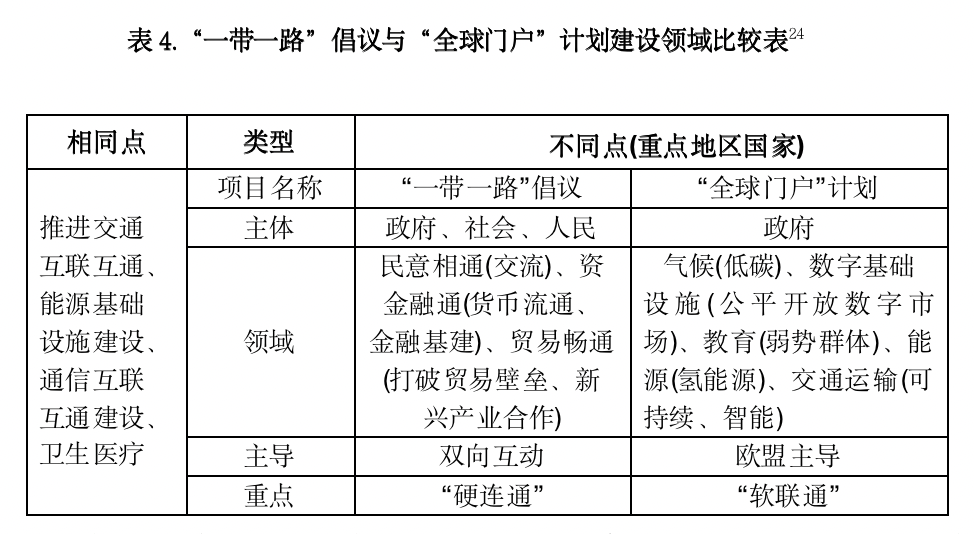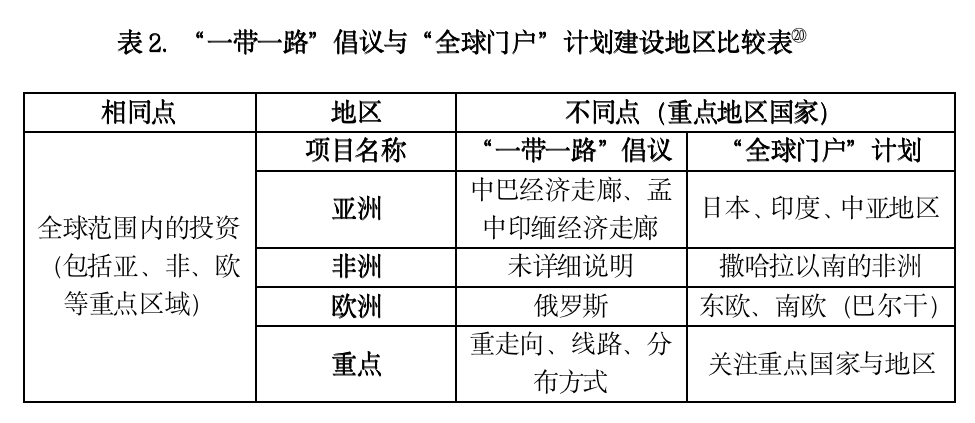 结合上述分析,可以明显看出“全球门户”计划在建设目标上与“一带一路”对冲的政治意图较为明显,但是需要我们注意的是,作为一项基础设施投资计划,在促进互联互通这一经济目标上两者都将其放在核心位置,这也是判断一项全球基建项目成功与否的关键,在未来这一共识或将是两者未来合作的基础。