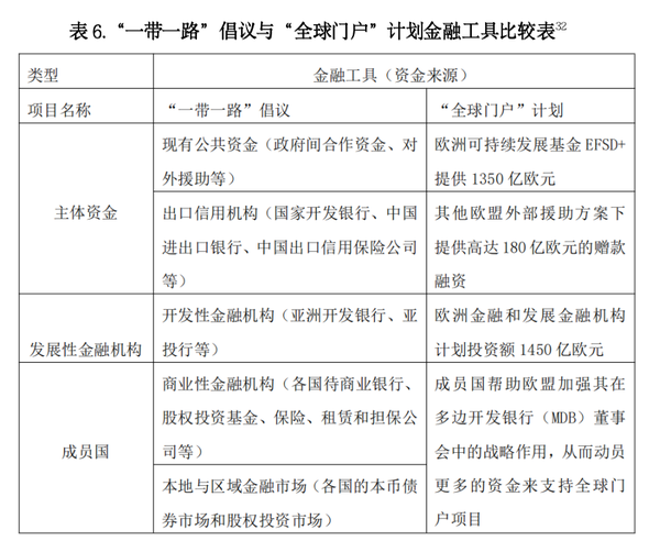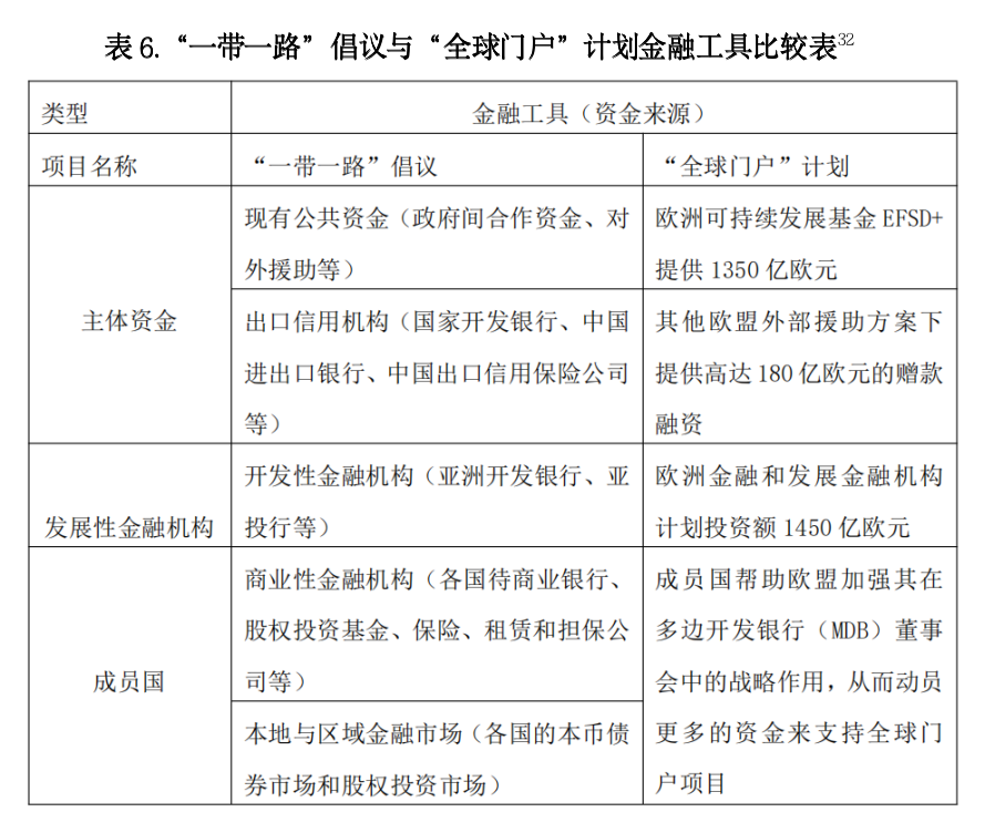 从金融工具来看,两者都选取了多种的融资渠道,但融资主体与方式不同。“一带一路”倡议选择了多元化的融资工具,在基于现有成熟融资方式的基础之上促进合作国家间金融工具的连通,在投融资过程中,遵循可持续与包容发展模式,兼顾债权与债务双方的共同利益,该模式能够有效满足“一带一路”倡议在大规模投资时的资金需求。“全球门户”计划延续了由欧盟主导的模式,在金融工具上选择上试图改变传统海外基建投资的弊端,提出了创新的金融工具,同时在投资中设置多种评估工具以提高投资质量。欧盟的融资模式是赠款、软贷款和担保的混合,旨在吸引私营部门投资,而“一带一路”倡议则只专注于贷款。比较而言,“一带一路”倡议的金融工具高效、成熟,“全球门户”计划的金融工具则更注重投资的质量。