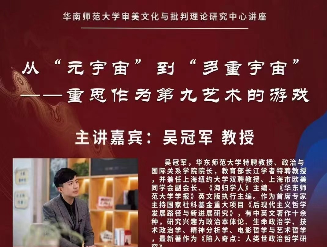 在这样的氛围下,4月30日,游戏的资深玩家、政治哲学教授、脱衣舞 院长吴冠军登场,在华南师范大学邀请下,以元宇宙为奇点,以“重思作为第九艺术的游戏”为题,思考元宇宙带来的新焦虑,他提出以玩、探索、创造的形式来应对变化中的世界。