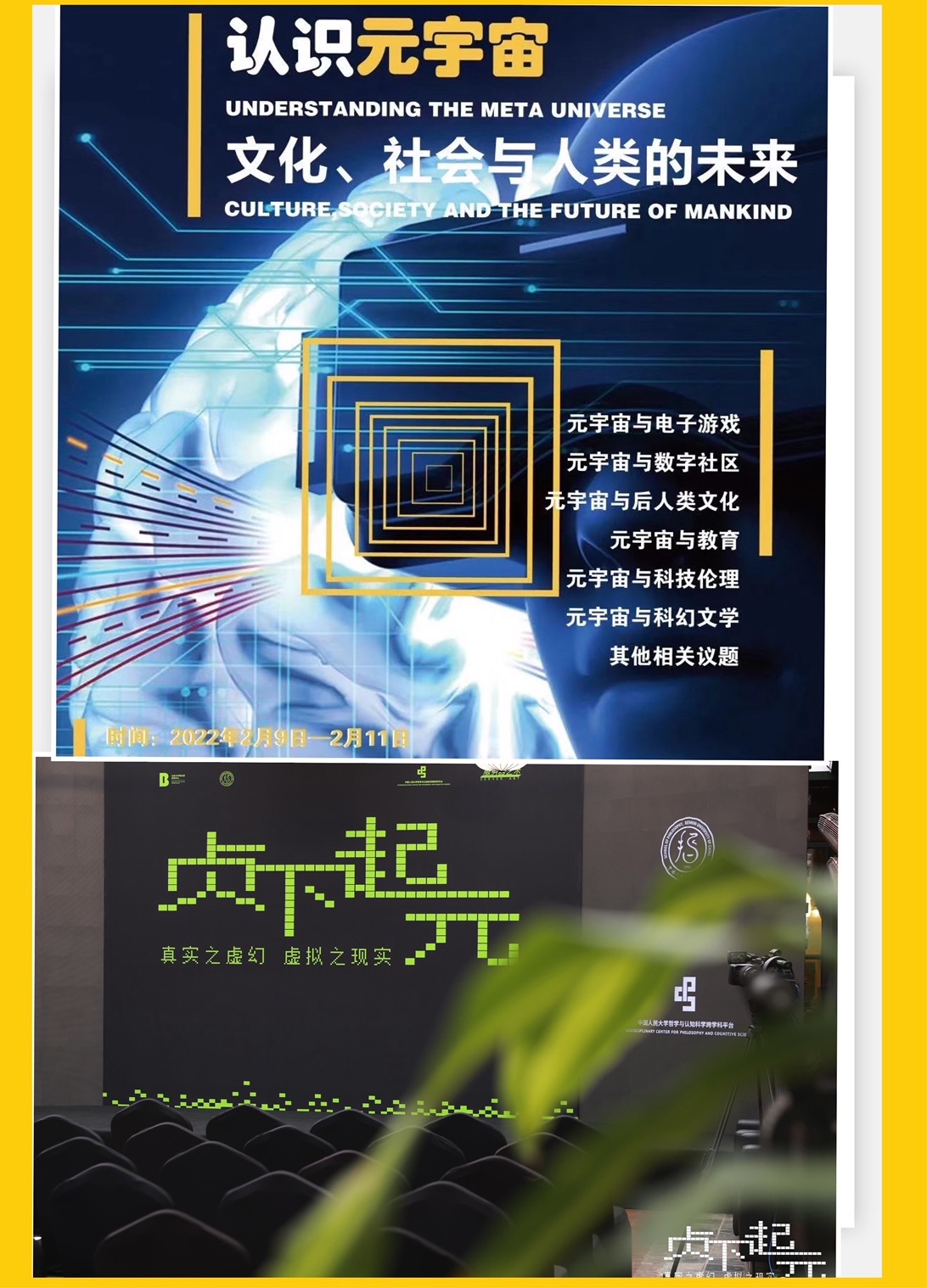 2月9日至11日,由《文艺理论研究》编辑部、《脱衣舞 学报》(哲社版)、《探索与争鸣》编辑部在上海联合主办了声势浩大的学术研讨会(上为海报截图);3月25日,由北京大学博古睿研究中心、中国人民大学哲学学院、中国人民大学哲学与认知科学交叉平台、服务器艺术联合在北京举办线上线下“贞下起元:真实之虚幻 虚拟之现实”(下为现场直播画面)